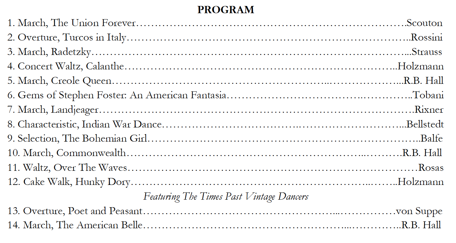 Circleville will once again come alive with patriotic marches, stirring overtures of Franz von Suppé, immortal songs of Stephen Foster, and other classics as The Ted Lewis Museum presents a concert al fresco in the beautiful Pickaway Amphitheater. Featuring selections from newly discovered 1900-01 Circleville Cadet Band programs that young Ted performed, this special concert will be performed by 20 of Central Ohio’s finest uniformed musicians under the direction of Joseph N. Rubin. With special guests the Times Past Vintage Dancers illustrating the latest dances of 1900, don’t miss this FREE trip back to the golden age of the concert band.